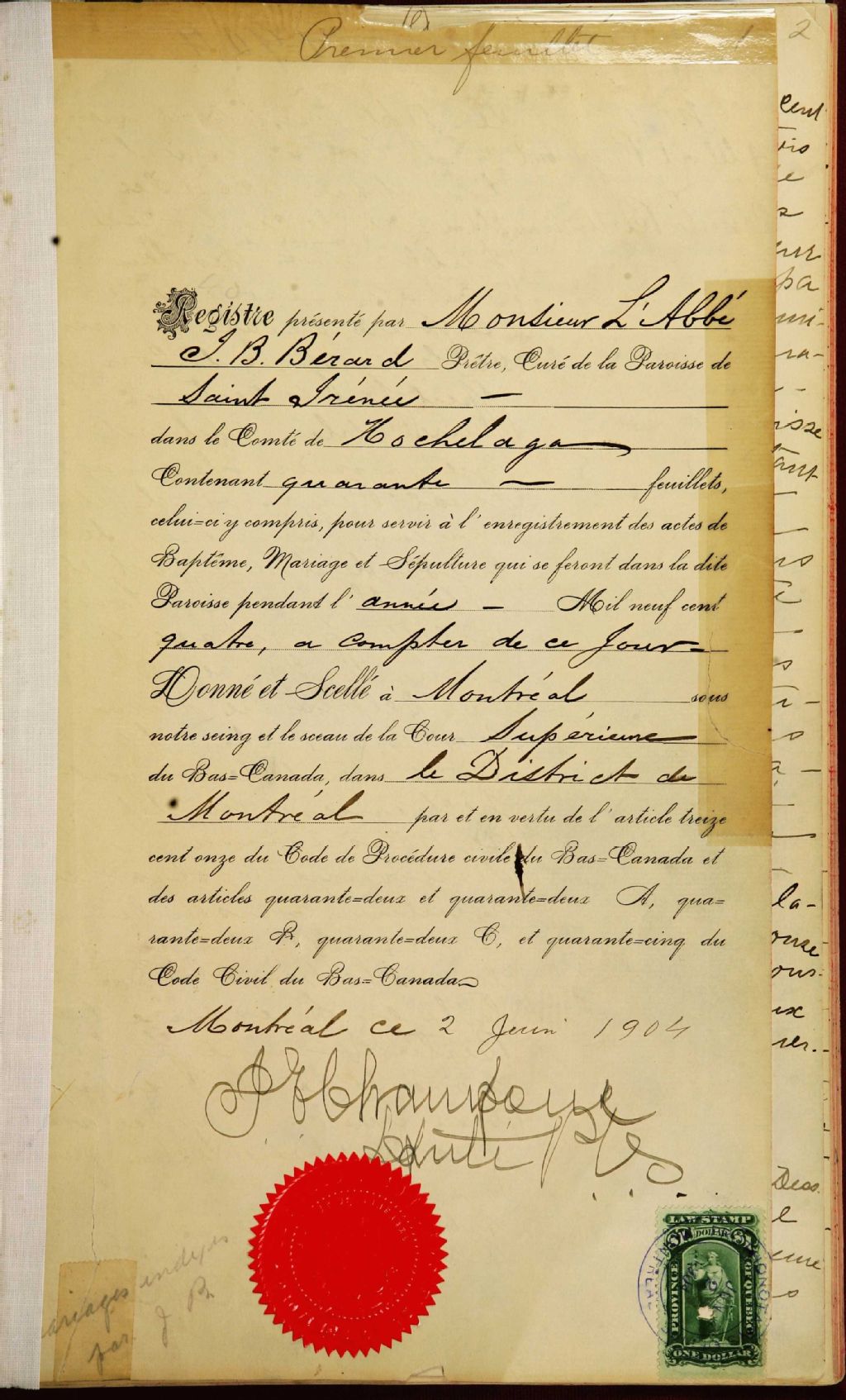 Saint-Irénée, 1904-1921, Archives nationales à Montréal, Fonds Cour supérieure. District judiciaire de Montréal. État civil, (06M,CE601,S241).