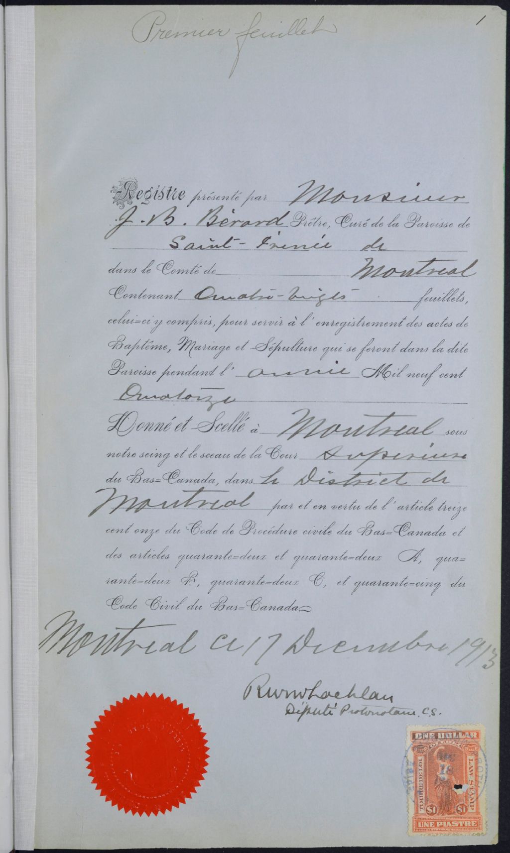 Saint-Irénée, 1904-1921, Archives nationales à Montréal, Fonds Cour supérieure. District judiciaire de Montréal. État civil, (06M,CE601,S241).