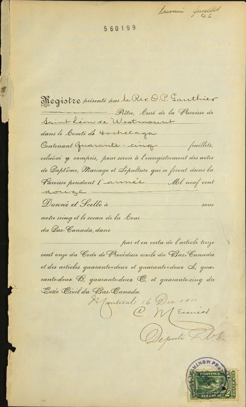 Saint-Léon, Westmount, 1901-1921, Archives nationales à Montréal, Fonds Cour supérieure. District judiciaire de Montréal. État civil, (06M,CE601,S243).