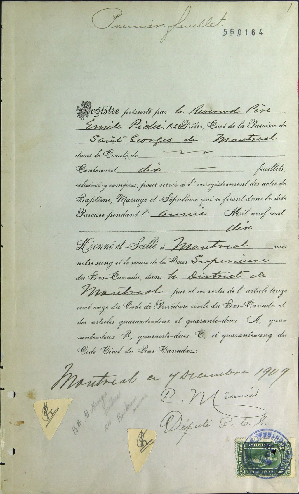 Saint-Georges, 1908-1921, Archives nationales à Montréal, Fonds Cour supérieure. District judiciaire de Montréal. État civil, (06M,CE601,S258).