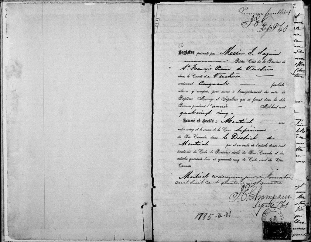 Saint-François-Xavier-de-Verchères, 1723-1923, Archives nationales à Montréal, Fonds Cour supérieure. District judiciaire de Montréal. État civil, (06M,CE601,S26).