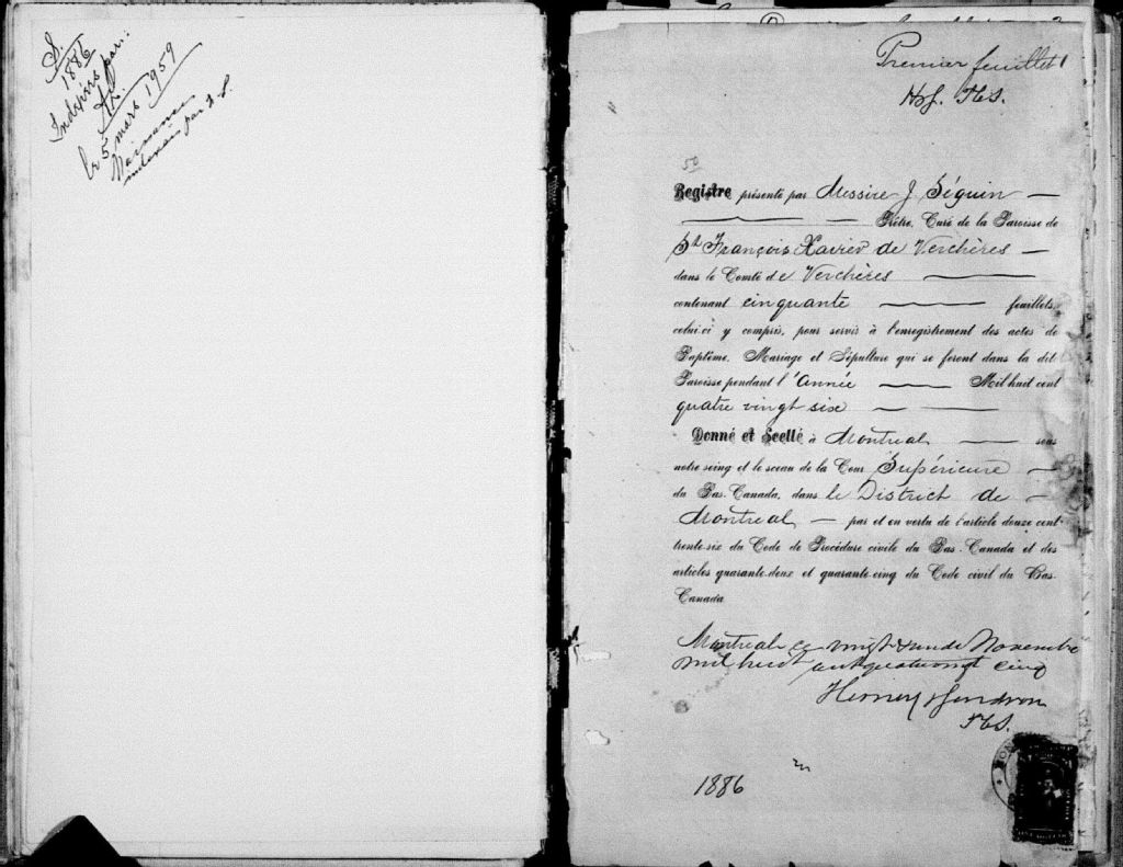 Saint-François-Xavier-de-Verchères, 1723-1923, Archives nationales à Montréal, Fonds Cour supérieure. District judiciaire de Montréal. État civil, (06M,CE601,S26).