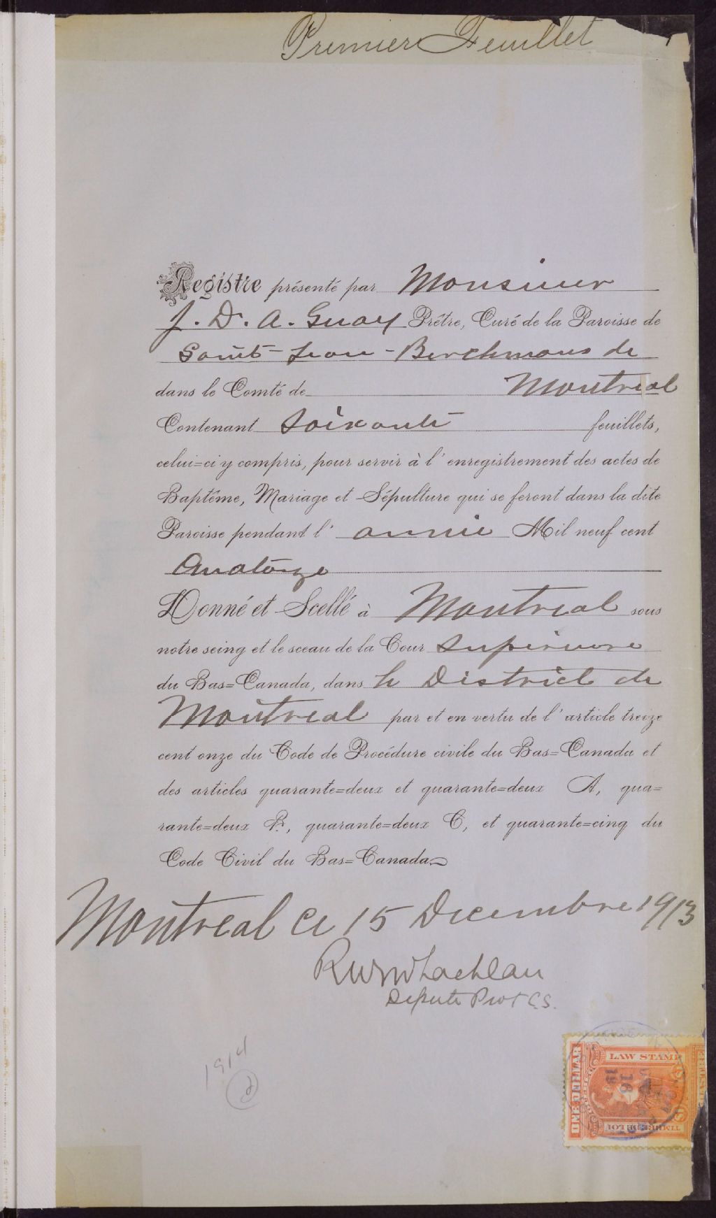 Saint-Jean-Berchmans, 1908-1921, Archives nationales à Montréal, Fonds Cour supérieure. District judiciaire de Montréal. État civil, (06M,CE601,S282).