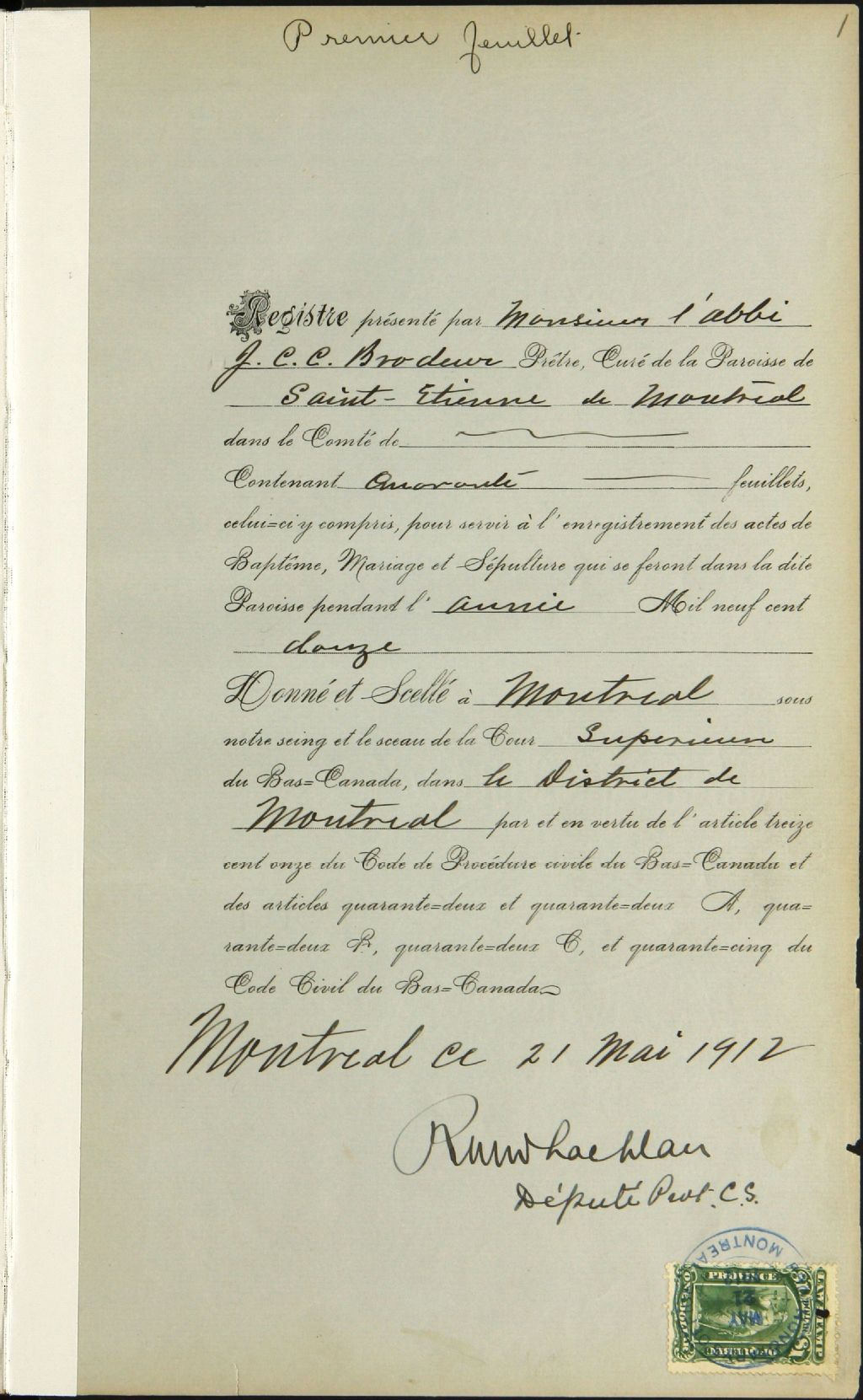 Saint-Étienne, 1912-1921, Archives nationales à Montréal, Fonds Cour supérieure. District judiciaire de Montréal. État civil, (06M,CE601,S318).