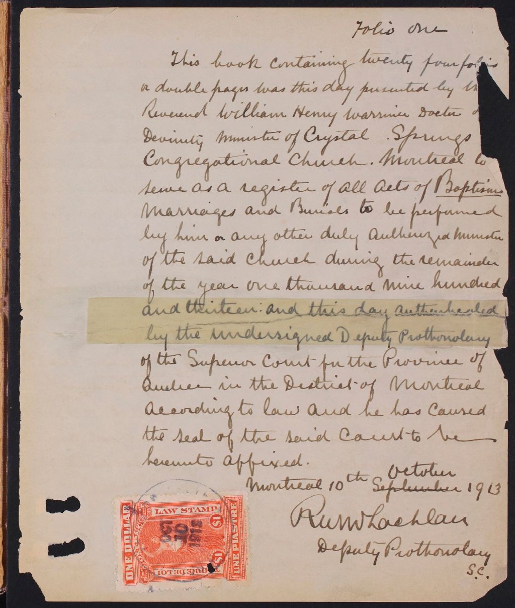 Crystal Spring Congregational Church, 1913-1921, Archives nationales à Montréal, Fonds Cour supérieure. District judiciaire de Montréal. État civil, (06M,CE601,S328).