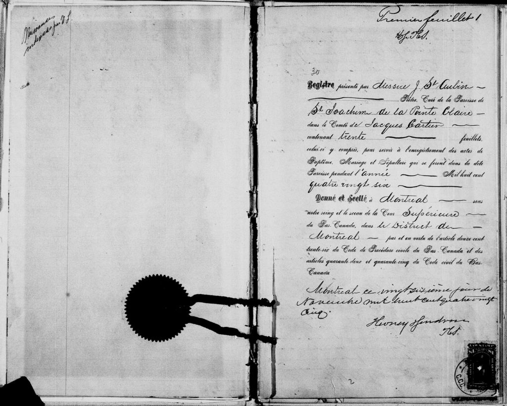 Saint-Joachim-de-la-Pointe-Claire, 1713-1922, Archives nationales à Montréal, Fonds Cour supérieure. District judiciaire de Montréal. État civil, (06M,CE601,S37).