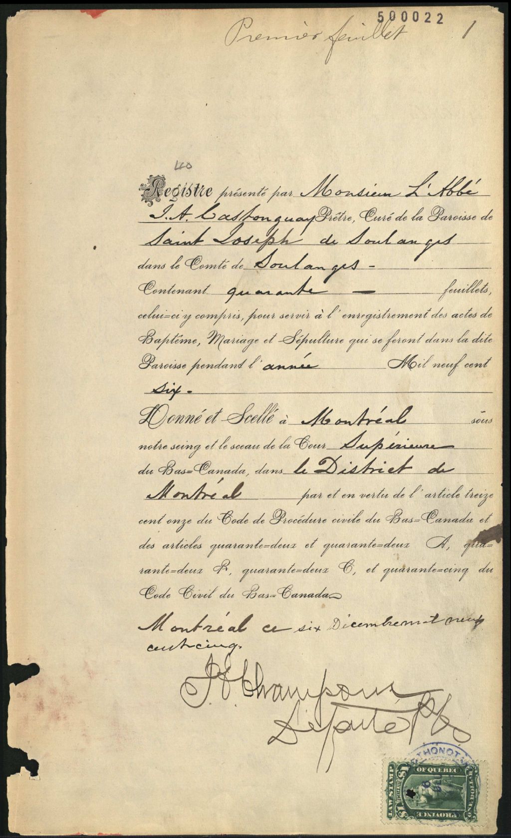 Saint-Joseph-de-Soulanges, 1752-1922, Archives nationales à Montréal, Fonds Cour supérieure. District judiciaire de Montréal. État civil, (06M,CE601,S41).