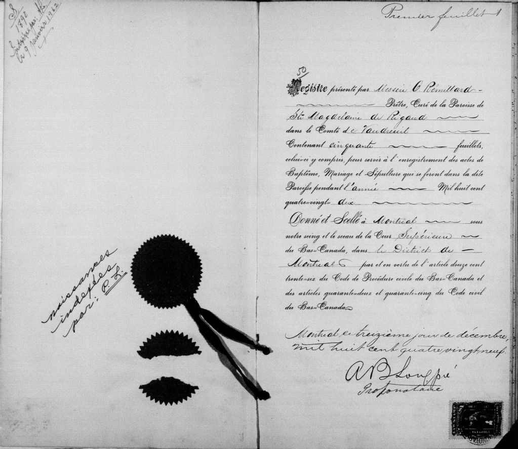 Sainte-Madeleine-de-Rigaud, 1802-1922, Archives nationales à Montréal, Fonds Cour supérieure. District judiciaire de Montréal. État civil, (06M,CE601,S45).