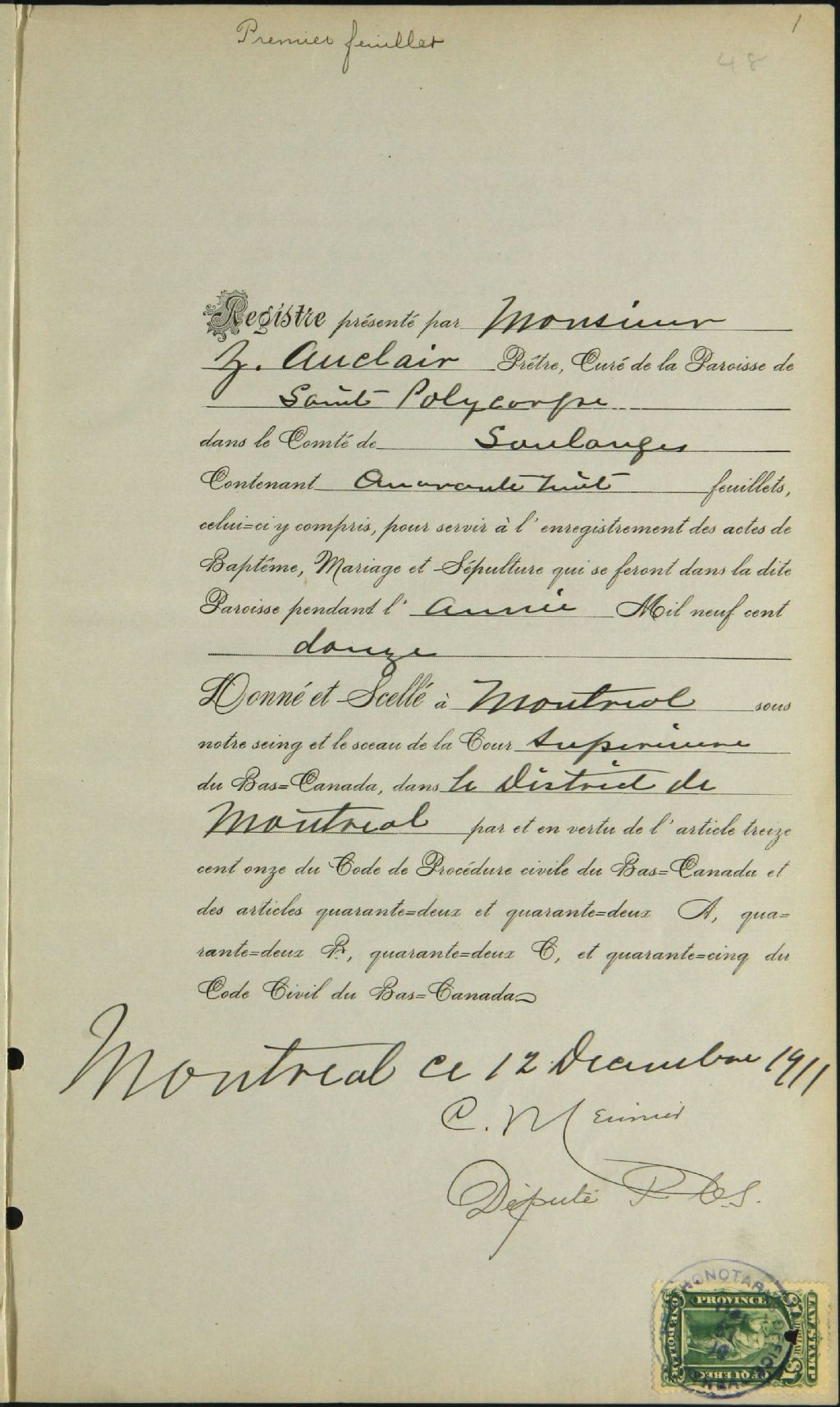 Saint-Polycarpe, 1819-1922, Archives nationales à Montréal, Fonds Cour supérieure. District judiciaire de Montréal. État civil, (06M,CE601,S55).