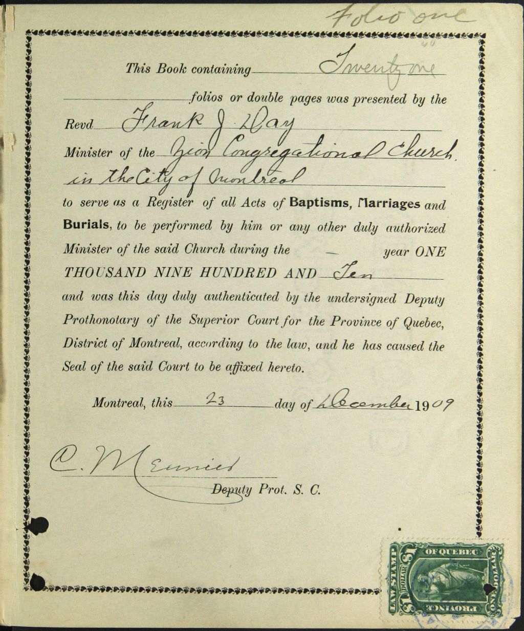 Zion Congregational Church, 1834-1920, Archives nationales à Montréal, Fonds Cour supérieure. District judiciaire de Montréal. État civil, (06M,CE601,S95).