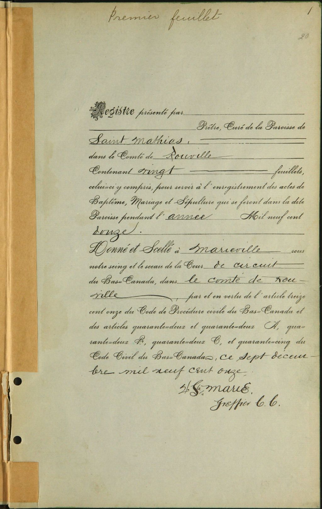 Saint-Mathias, 1739-1921, Archives nationales à Montréal, Fonds Cour supérieure. District judiciaire de Saint-Hyacinthe. État civil, (06M,CE602,S22).