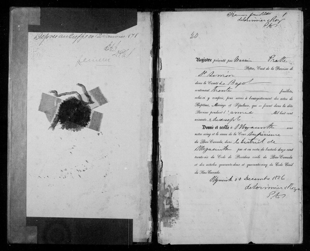 Saint-Simon, 1833-1921, Archives nationales à Montréal, Fonds Cour supérieure. District judiciaire de Saint-Hyacinthe. État civil, (06M,CE602,S26).