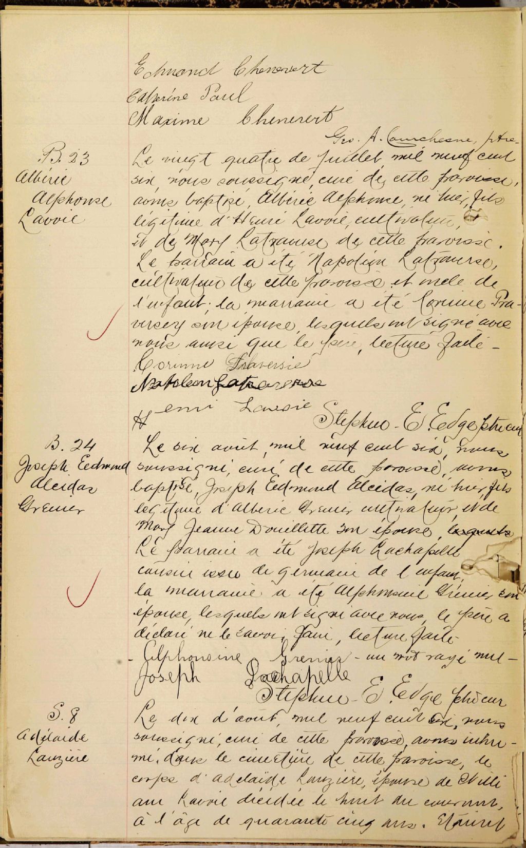 Notre-Dame-de-Pierreville, 1893-1921, Archives nationales à Montréal, Fonds Cour supérieure. District judiciaire de Richelieu. État civil, (06M,CE603,S20).