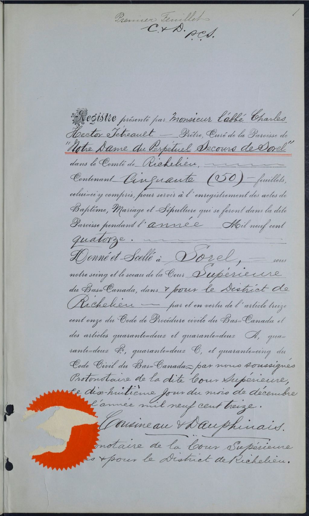Notre-Dame-du-Perpétuel-Secours, 1911-1921, Archives nationales à Montréal, Fonds Cour supérieure. District judiciaire de Richelieu. État civil, (06M,CE603,S27).