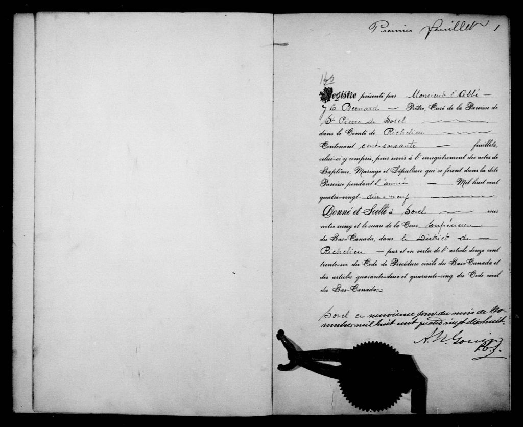 Saint-Pierre-de-Sorel, 1679-1921, Archives nationales à Montréal, Fonds Cour supérieure. District judiciaire de Richelieu. État civil, (06M,CE603,S7).
