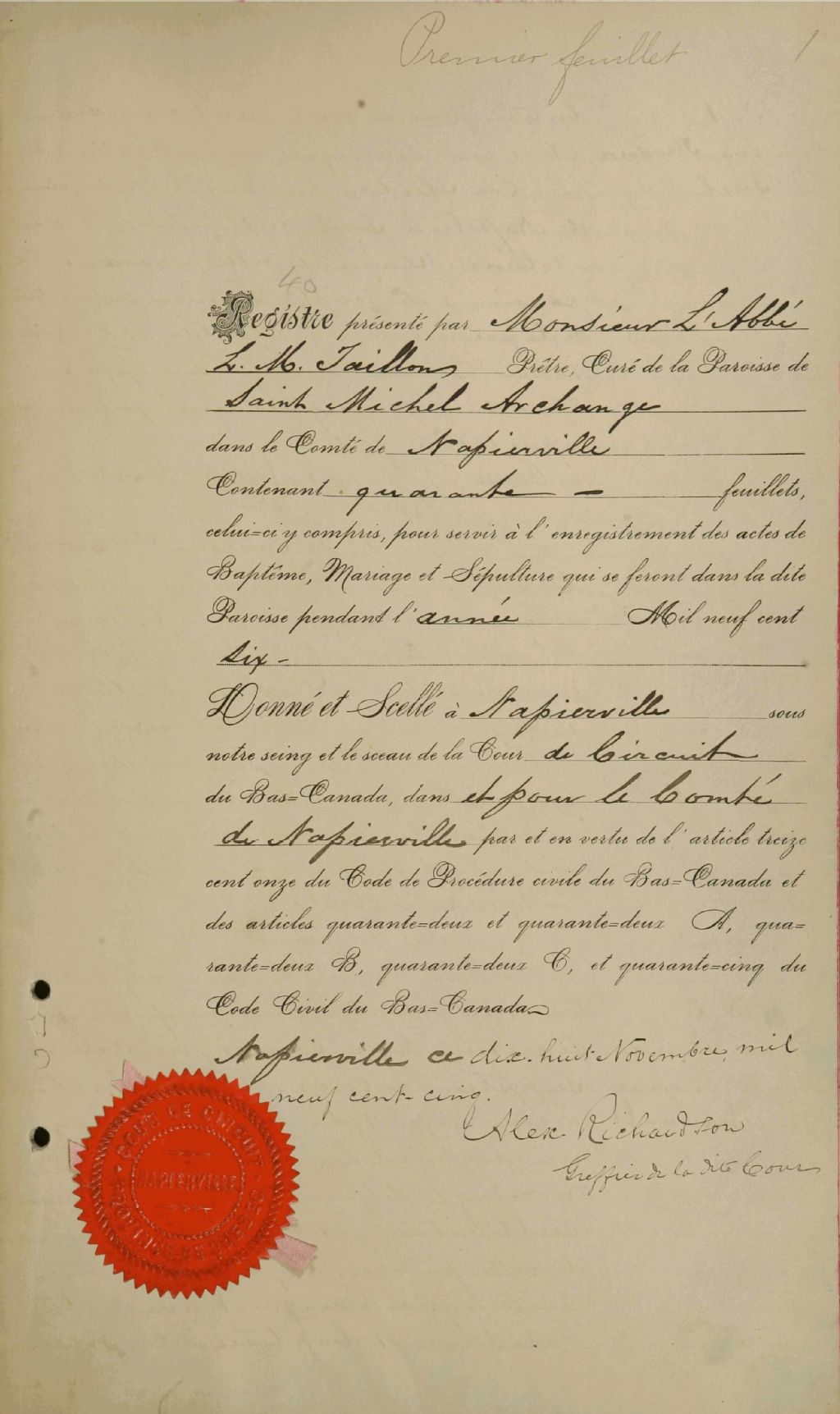 Saint-Michel-Archange, 1854-1921, Archives nationales à Montréal, Fonds Cour supérieure. District judiciaire d'Iberville. État civil, (06M,CE604,S12).