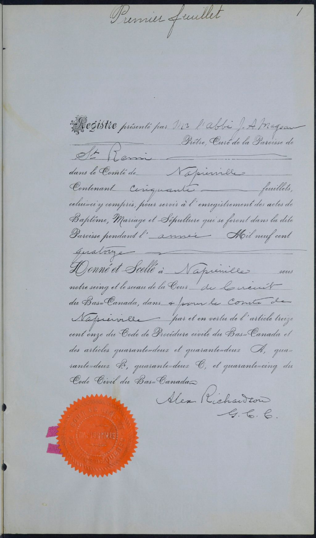 Saint-Rémi-de-La Salle, 1830-1921, Archives nationales à Montréal, Fonds Cour supérieure. District judiciaire d'Iberville. État civil, (06M,CE604,S14).