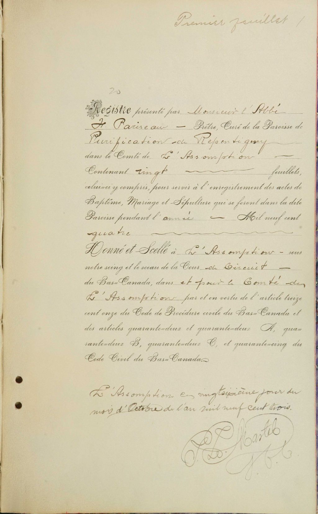La Purification-de-Repentigny, 1681-1921, Archives nationales à Montréal, Fonds Cour supérieure. District judiciaire de Joliette. État civil, (06M,CE605,S16).