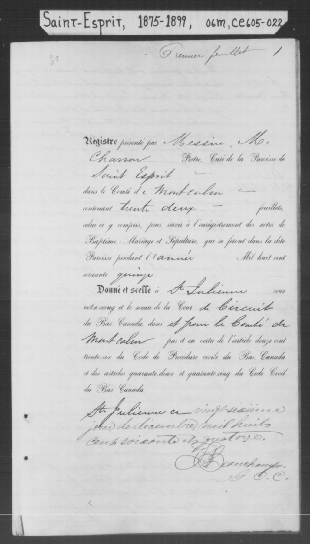 Saint-Esprit, 1808-1921, Archives nationales à Montréal, Fonds Cour supérieure. District judiciaire de Joliette. État civil, (06M,CE605,S22).