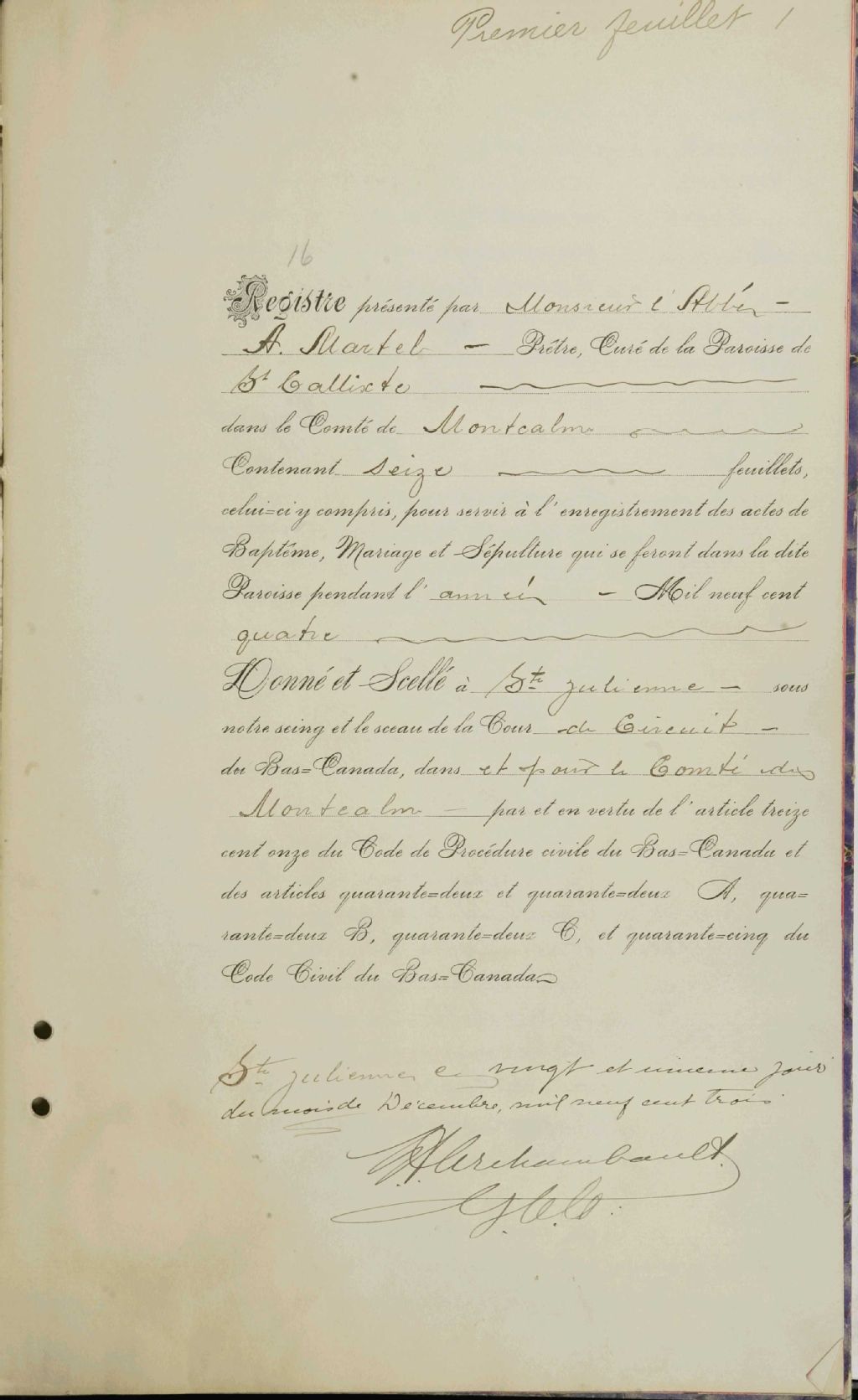 Saint-Calixte, 1854-1921, Archives nationales à Montréal, Fonds Cour supérieure. District judiciaire de Joliette. État civil, (06M,CE605,S27).