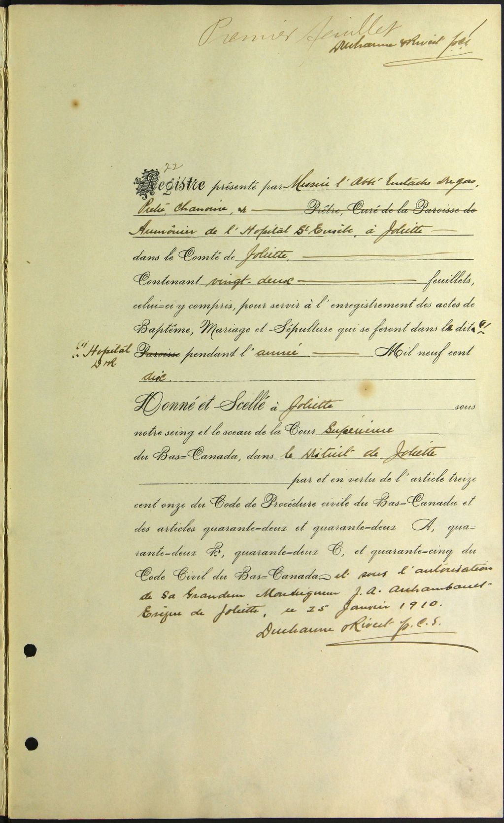 Hôpital Saint-Eusèbe, 1910-1920, Archives nationales à Montréal, Fonds Cour supérieure. District judiciaire de Joliette. État civil, (06M,CE605,S64).