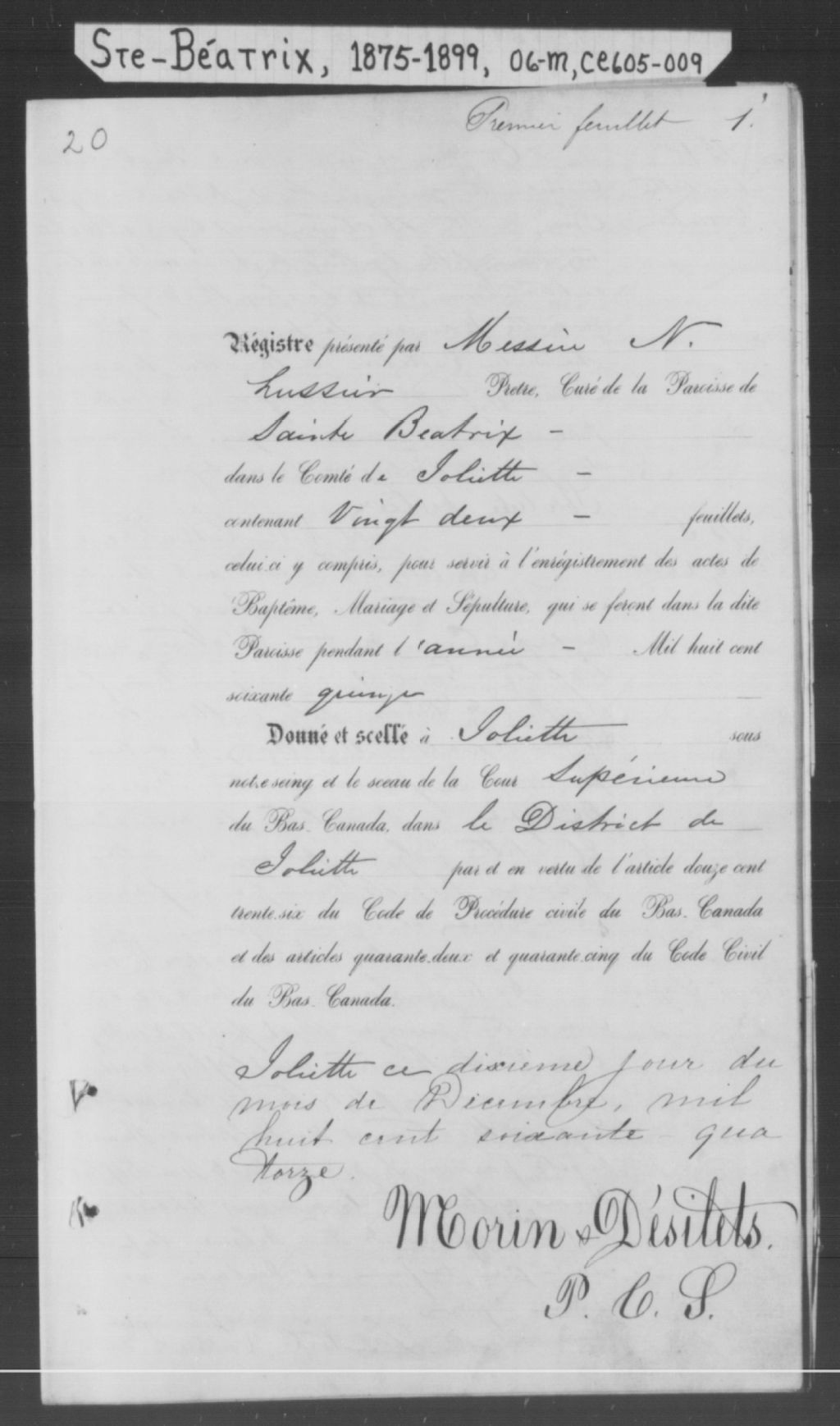 Sainte-Béatrix, 1861-1921, Archives nationales à Montréal, Fonds Cour supérieure. District judiciaire de Joliette. État civil, (06M,CE605,S9).