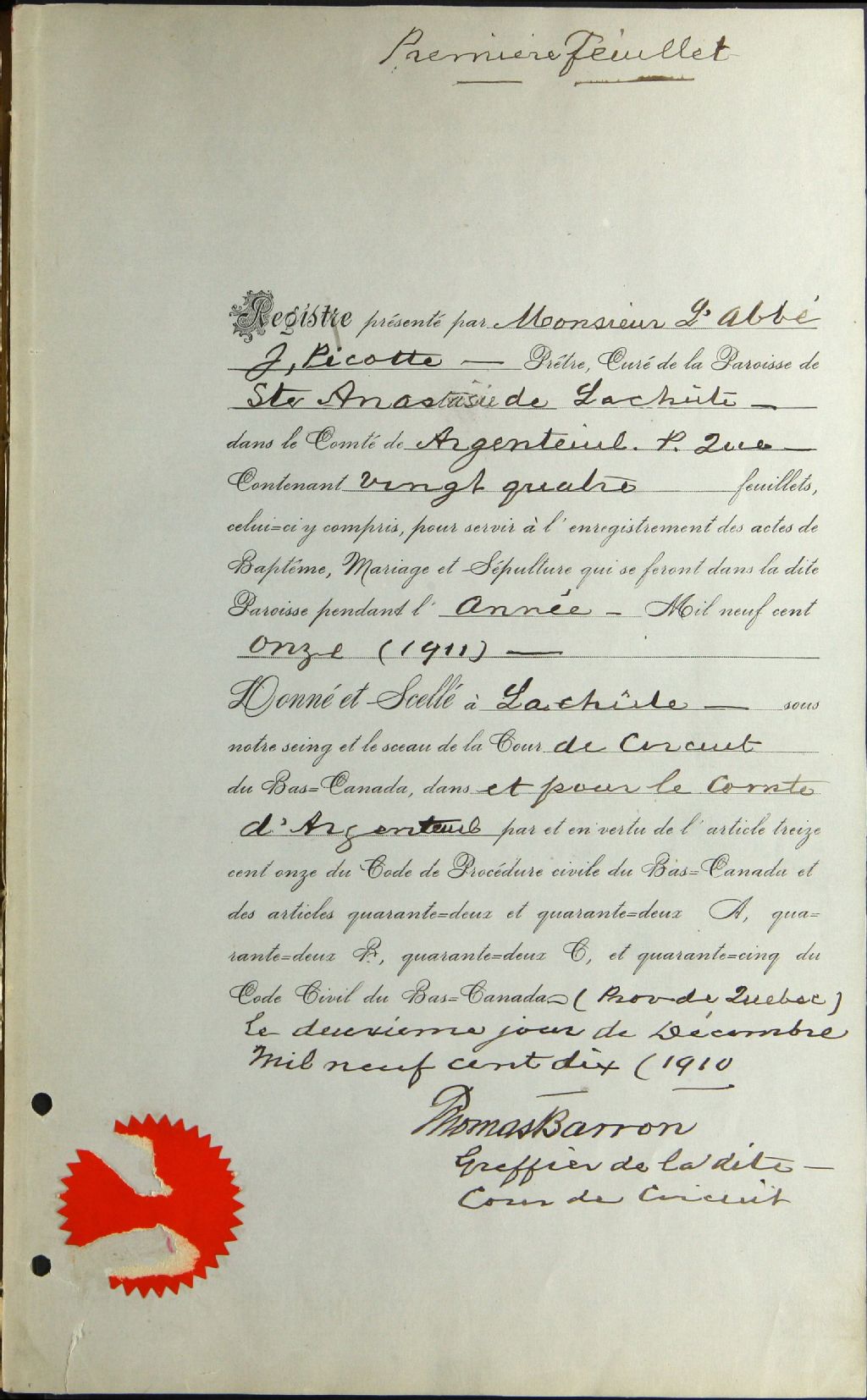 Sainte-Anastasie-de-Lachute, 1878-1921, Archives nationales à Montréal, Fonds Cour supérieure. District judiciaire de Terrebonne. État civil, (06M,CE606,S2).