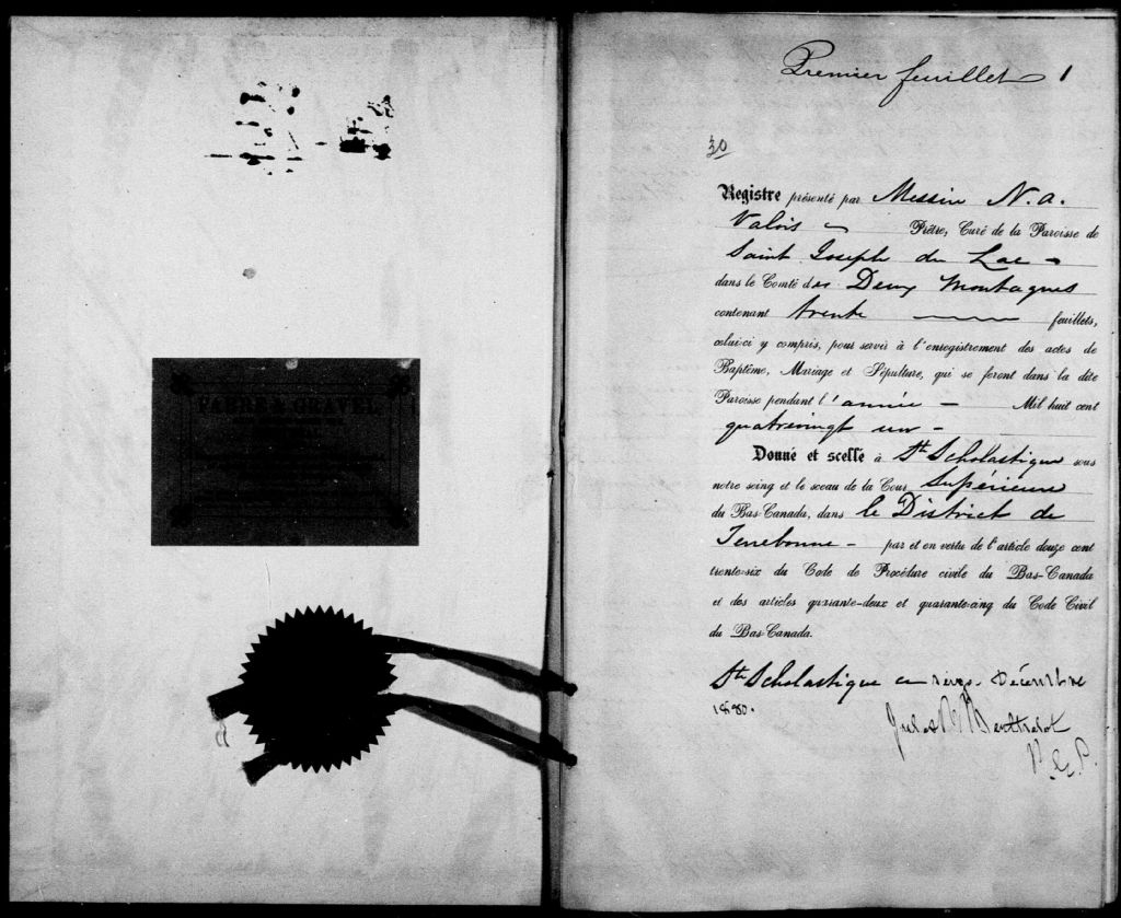 Patronage-de-Saint-Joseph, 1855-1921, Archives nationales à Montréal, Fonds Cour supérieure. District judiciaire de Terrebonne. État civil, (06M,CE606,S20).