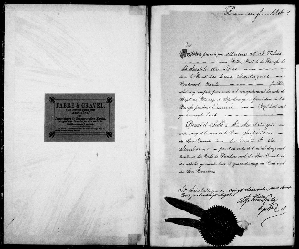 Patronage-de-Saint-Joseph, 1855-1921, Archives nationales à Montréal, Fonds Cour supérieure. District judiciaire de Terrebonne. État civil, (06M,CE606,S20).