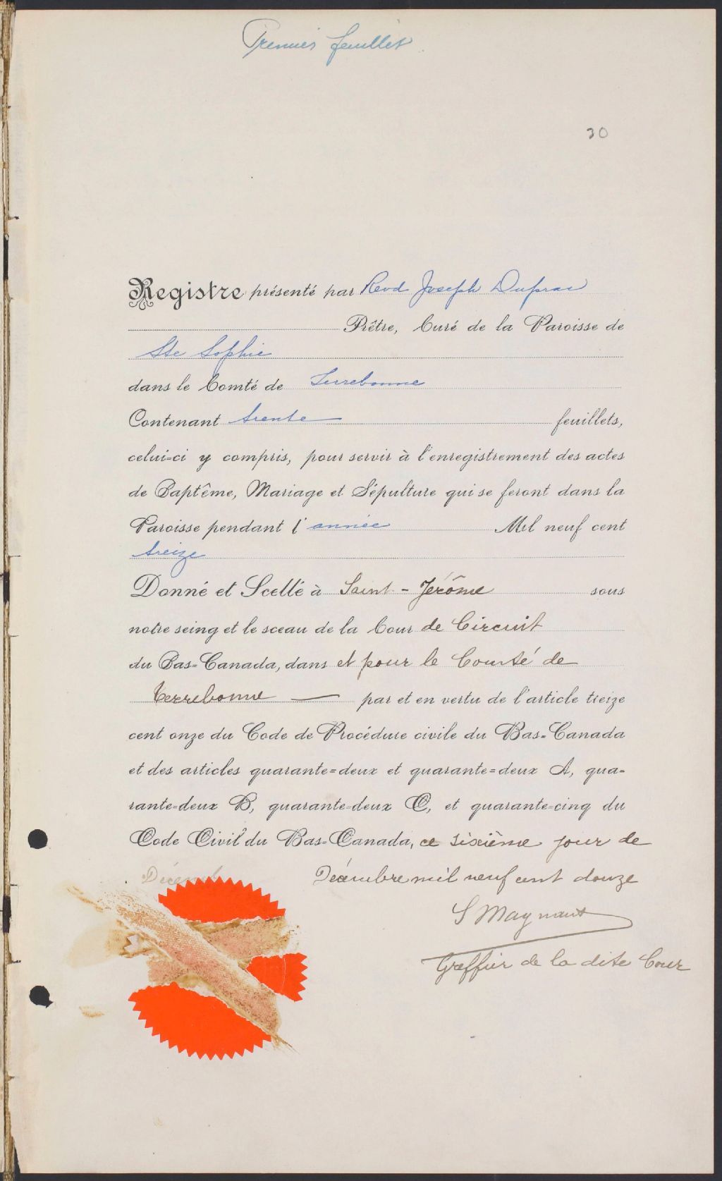 Sainte-Sophie, 1852-1921, Archives nationales à Montréal, Fonds Cour supérieure. District judiciaire de Terrebonne. État civil, (06M,CE606,S21).