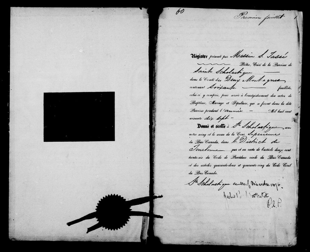 Sainte-Scholastique, 1825-1921, Archives nationales à Montréal, Fonds Cour supérieure. District judiciaire de Terrebonne. État civil, (06M,CE606,S22).