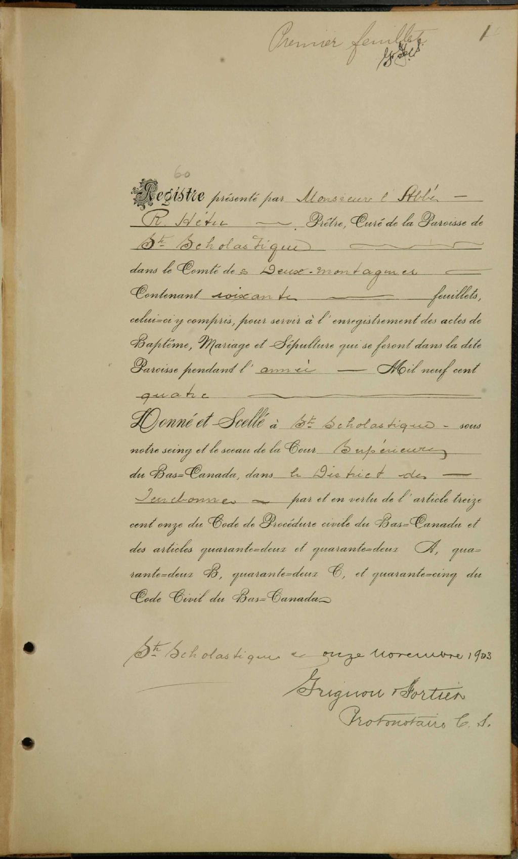 Sainte-Scholastique, 1825-1921, Archives nationales à Montréal, Fonds Cour supérieure. District judiciaire de Terrebonne. État civil, (06M,CE606,S22).
