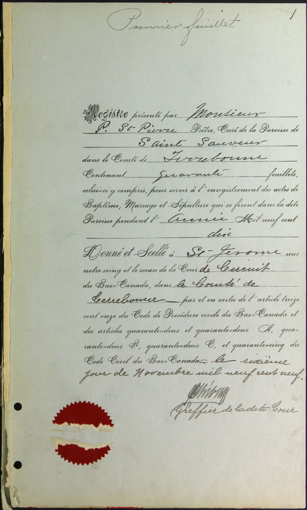 Saint-Sauveur, 1853-1921, Archives nationales à Montréal, Fonds Cour supérieure. District judiciaire de Terrebonne. État civil, (06M,CE606,S23).