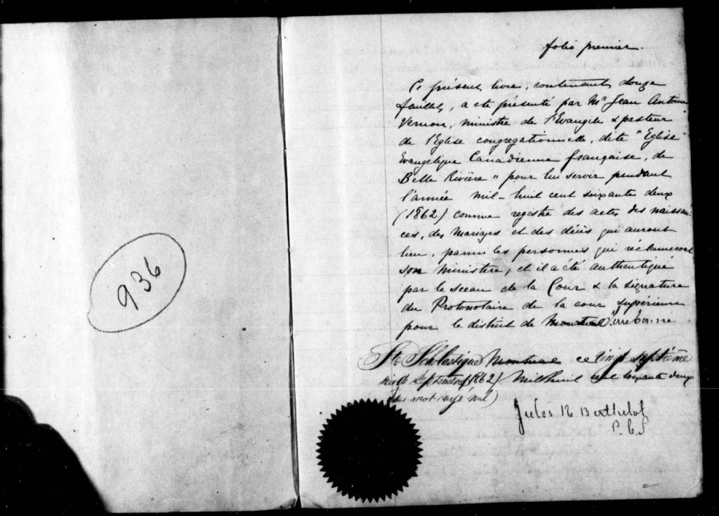 Église presbytérienne de Belle Rivière, 1862-1915, Archives nationales à Montréal, Fonds Cour supérieure. District judiciaire de Terrebonne. État civil, (06M,CE606,S36).