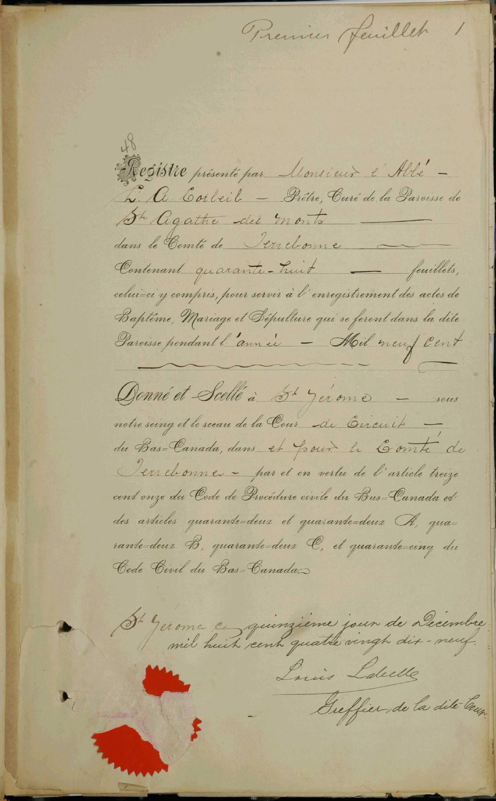 Sainte-Agathe-des-Monts, 1861-1921, Archives nationales à Montréal, Fonds Cour supérieure. District judiciaire de Terrebonne. État civil, (06M,CE606,S4).