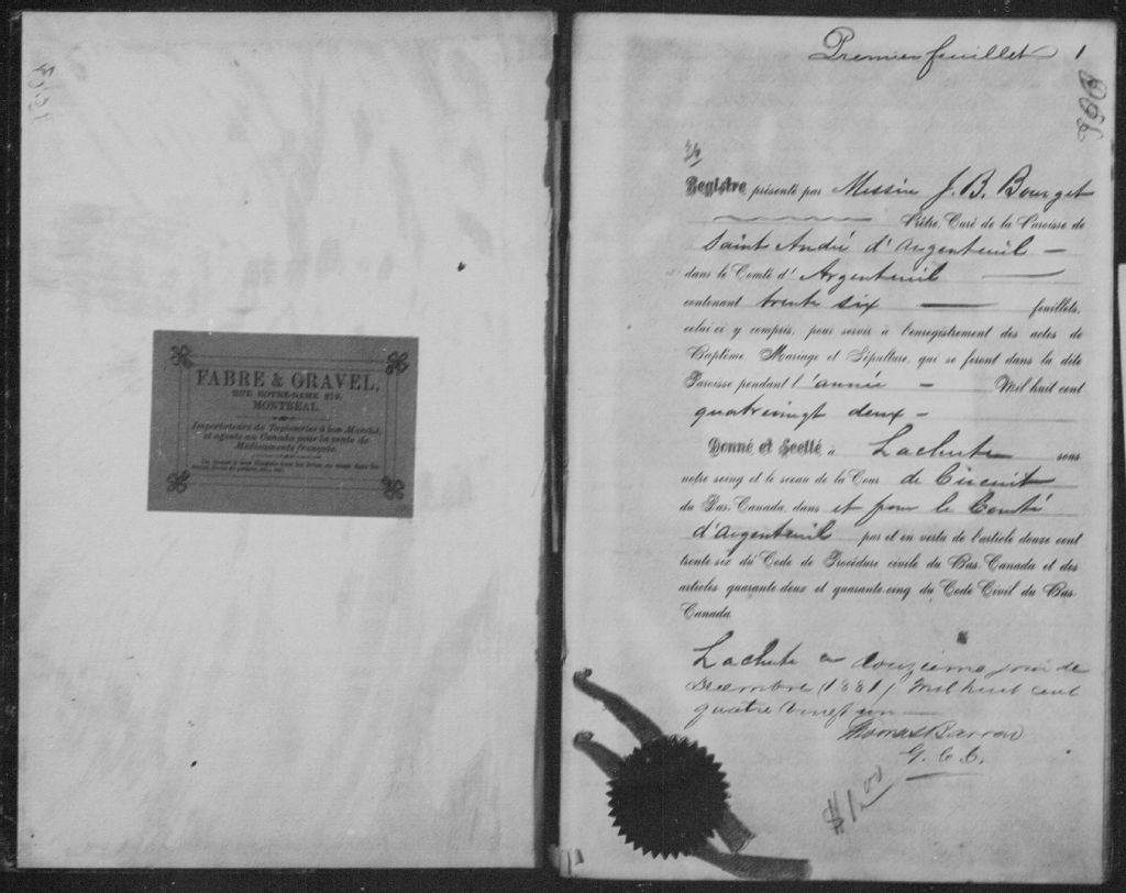 Saint-André-d'Argenteuil, 1833-1921, Archives nationales à Montréal, Fonds Cour supérieure. District judiciaire de Terrebonne. État civil, (06M,CE606,S7).