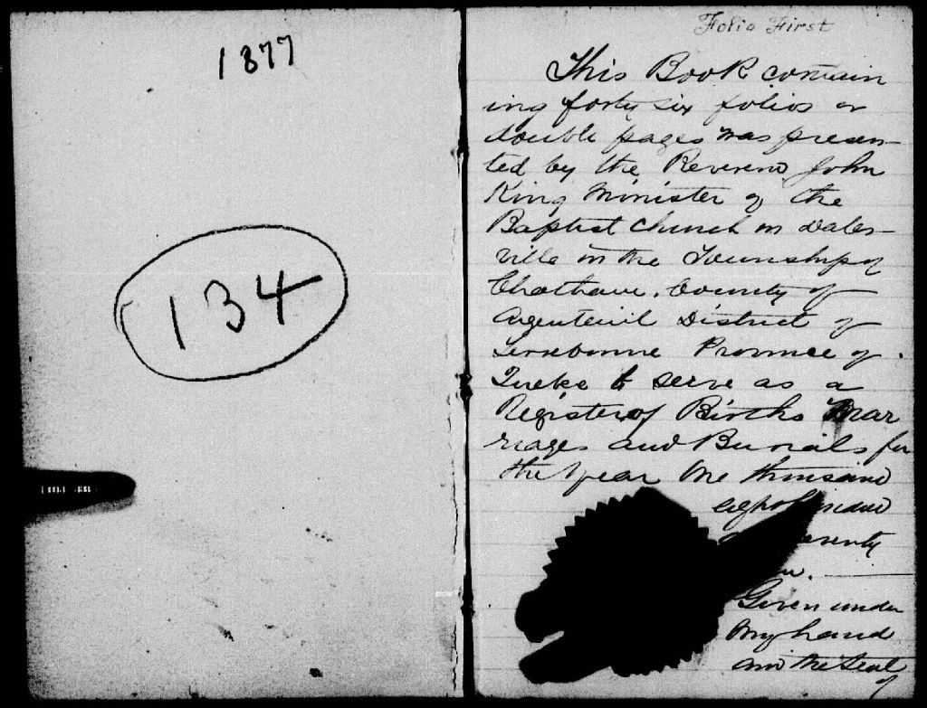 Dalesville Baptist Church, 1877-1910, 1914-1916, 1920, Archives nationales à Montréal, Fonds Cour supérieure. District judiciaire de Terrebonne. État civil, (06M,CE606,S71).