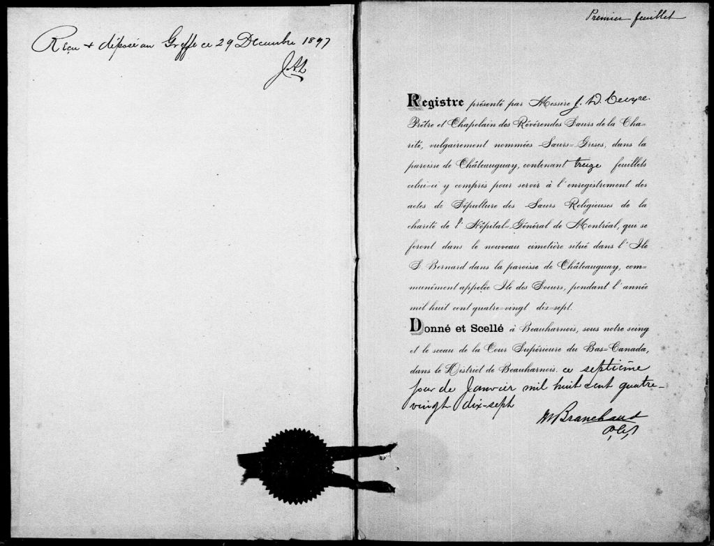 Cimetière des Soeurs de la Charité, 1897-1921, Archives nationales à Montréal, Fonds Cour supérieure. District judiciaire de Beauharnois. État civil, (06M,CE607,S1).
