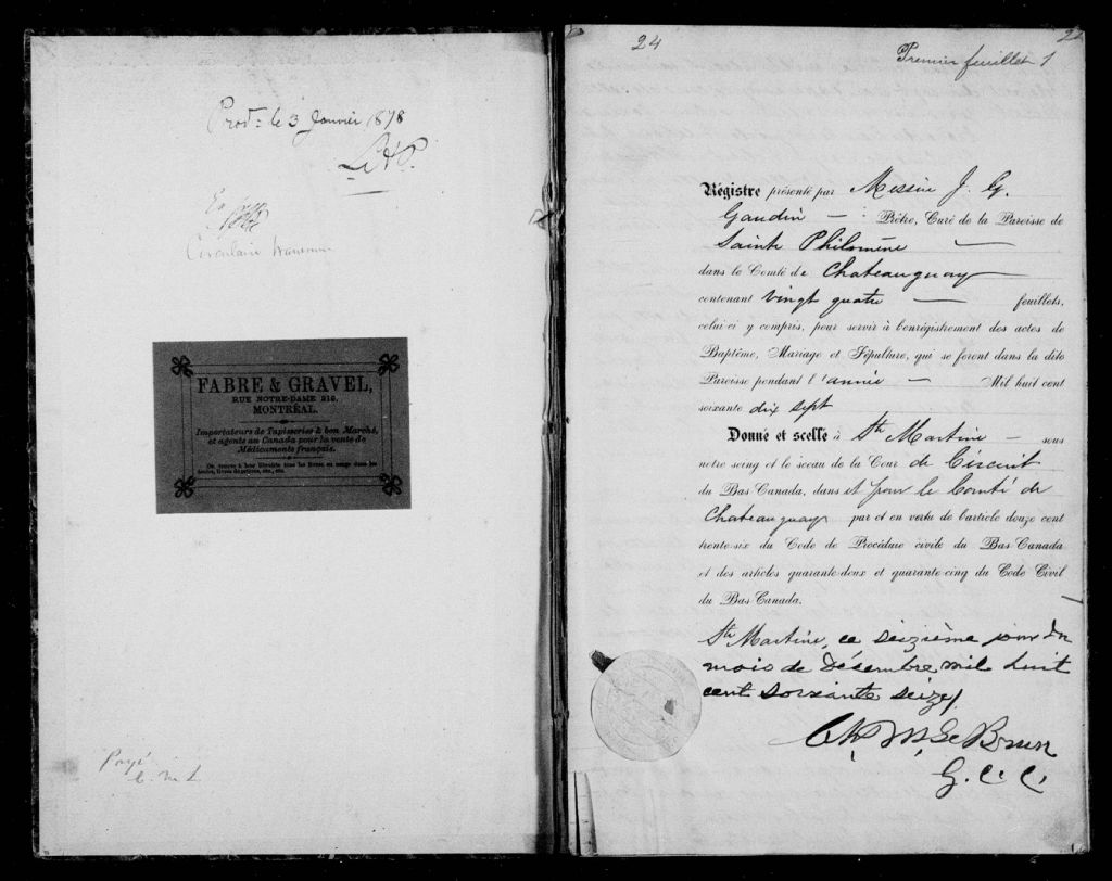 Sainte-Philomène, 1840-1921, Archives nationales à Montréal, Fonds Cour supérieure. District judiciaire de Beauharnois. État civil, (06M,CE607,S14).