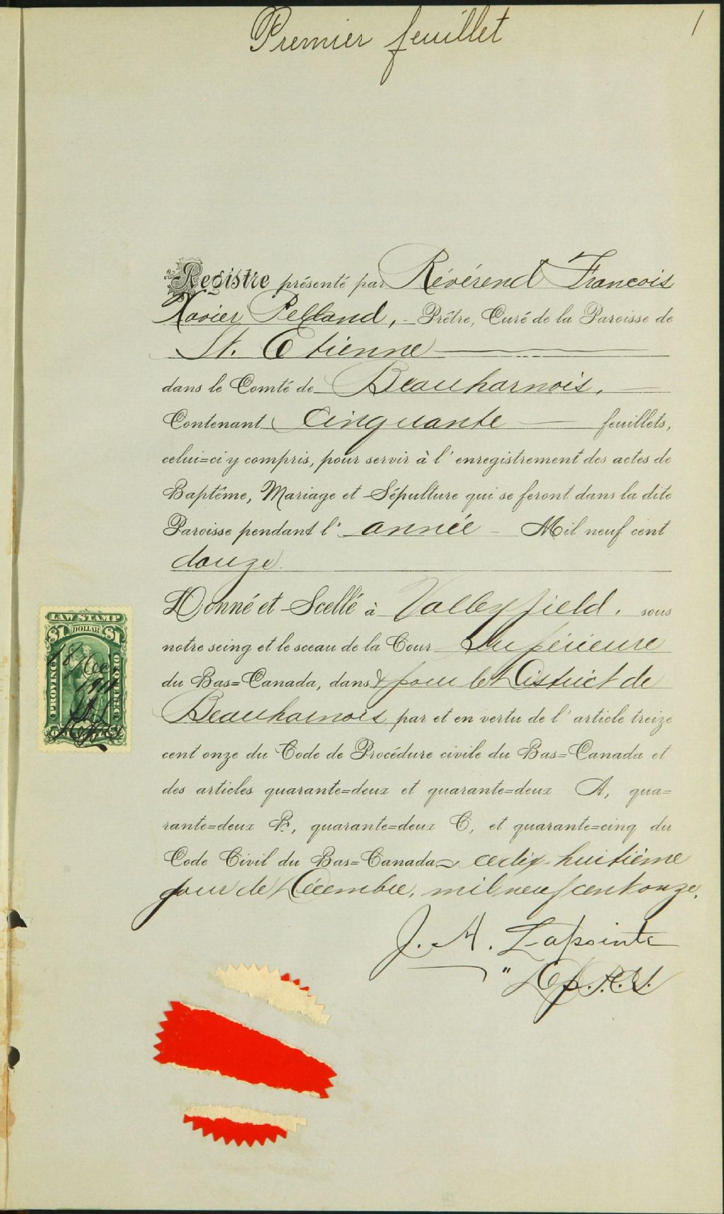 Saint-Étienne-de-Beauharnois, 1869-1921, Archives nationales à Montréal, Fonds Cour supérieure. District judiciaire de Beauharnois. État civil, (06M,CE607,S5).