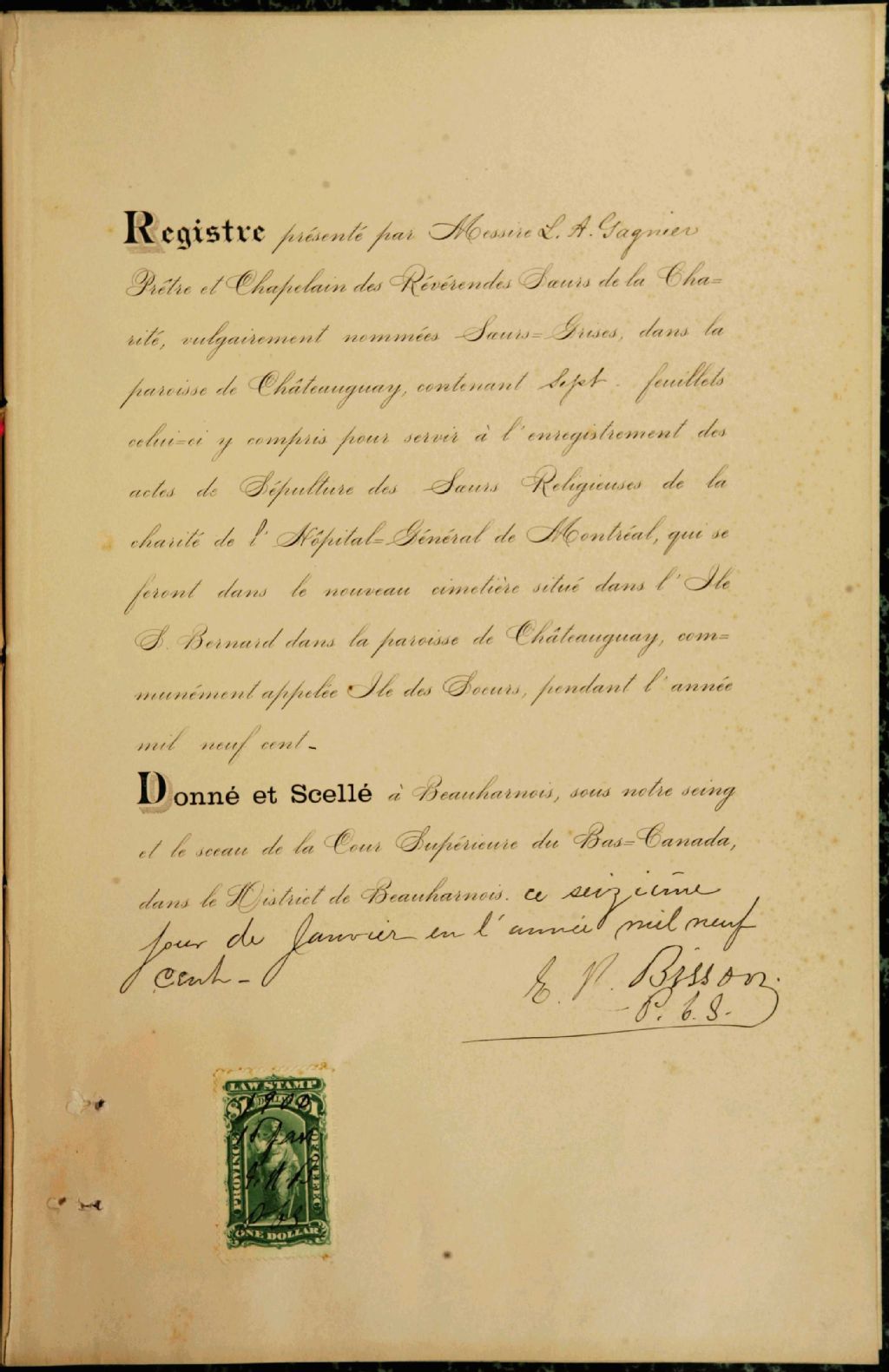 Soeurs Grises, Châteauguay, 1900-1904, Archives nationales à Montréal, Fonds Cour supérieure. District judiciaire de Beauharnois. État civil, (06M,CE607,S76).