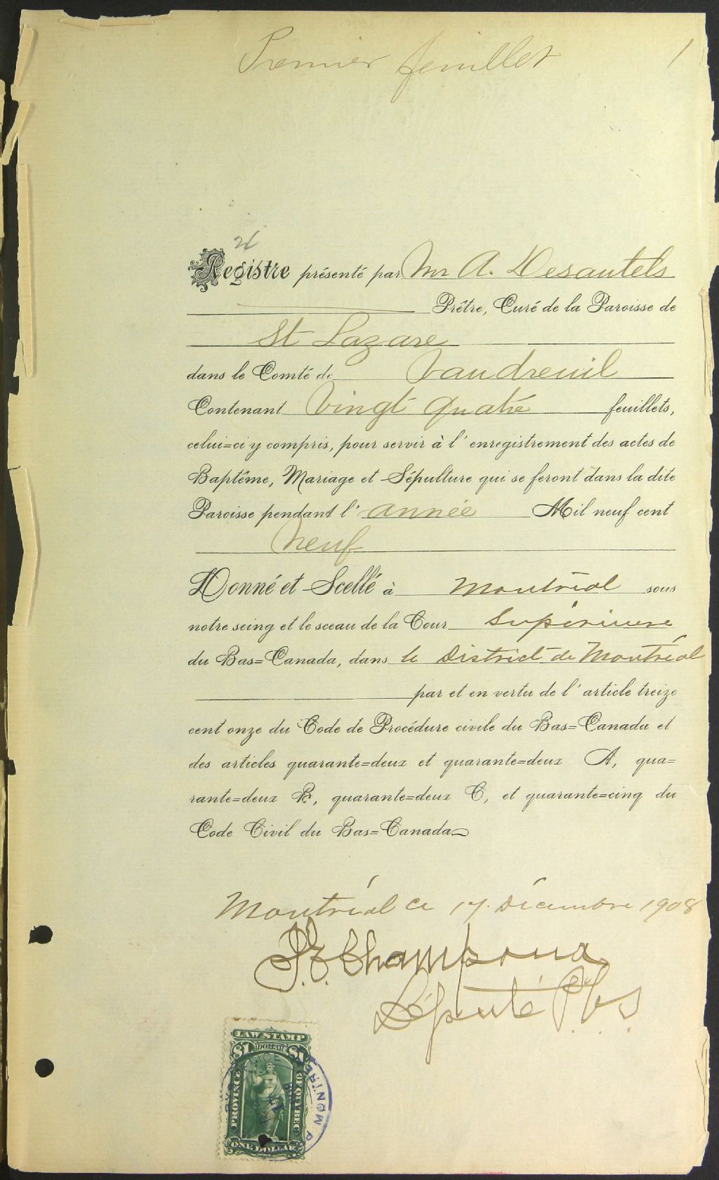 Saint-Lazare, 1877-1921, Archives nationales à Montréal, Fonds Cour supérieure. District judiciaire de Beauharnois. État civil, (06M,CE607,S9).