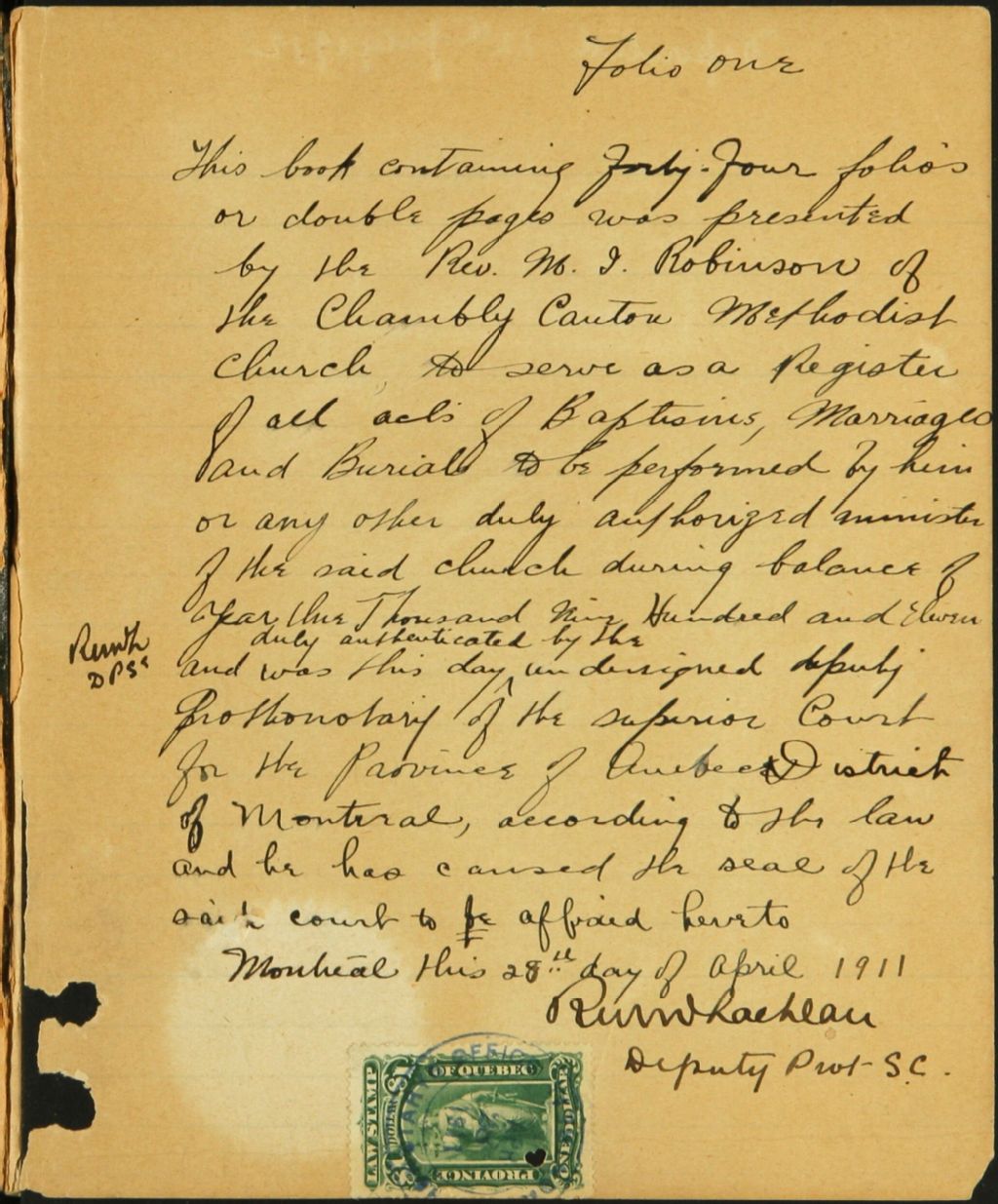 Chambly Methodist Church, 1907, 1912, Archives nationales à Montréal, Fonds Cour supérieure. District judiciaire de Longueuil. État civil, (06M,CE608,S2).