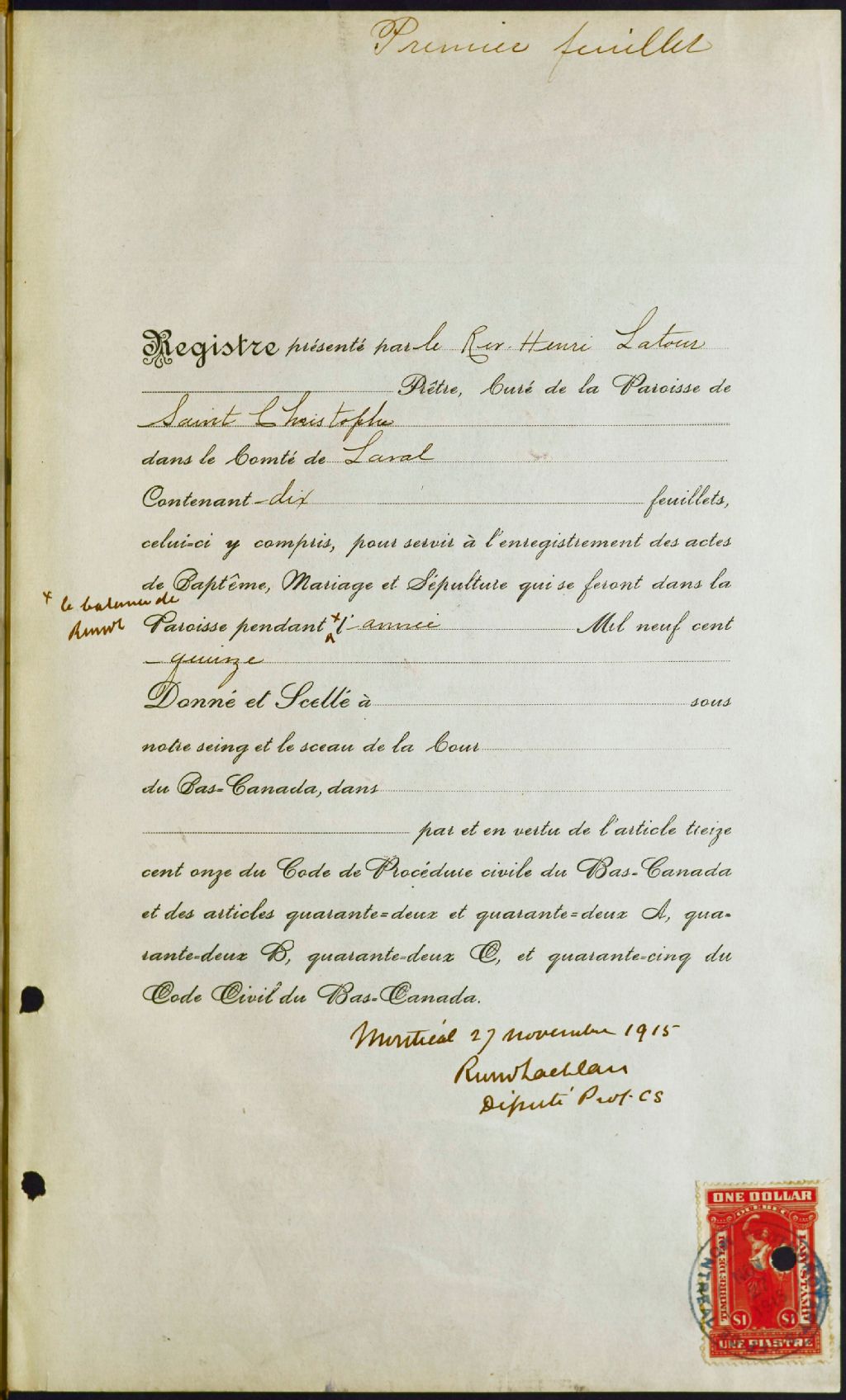Saint-Christophe, 1915-1921, Archives nationales à Montréal, Fonds Cour supérieure. District judiciaire de Laval. État civil, (06M,CE609,S3).