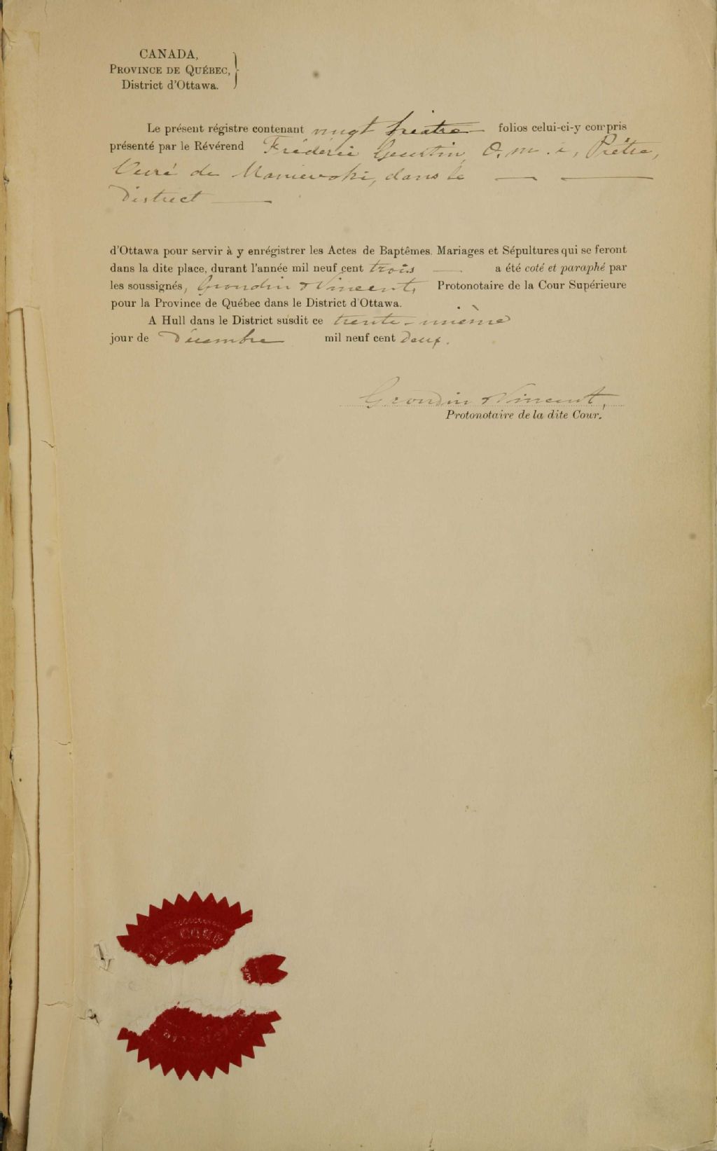 L'Assomption-de-la-Vierge-Marie-de-Maniwaki, 1900-1921, Archives nationales à Montréal, Fonds Cour supérieure. District judiciaire de Labelle. État civil, (06M,CE610,S1).