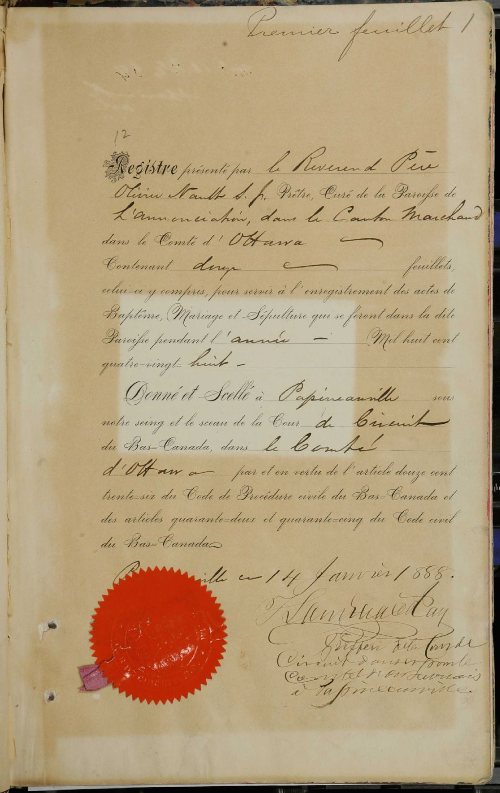 L'Annonciation, 1888-1921, Archives nationales à Montréal, Fonds Cour supérieure. District judiciaire de Labelle. État civil, (06M,CE610,S23).