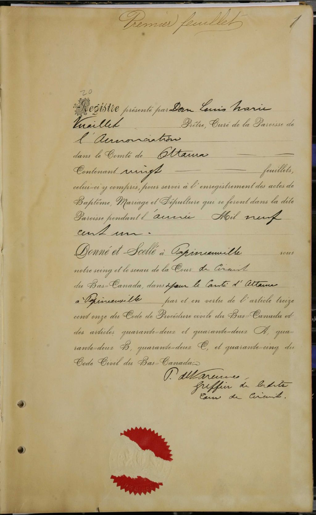 L'Annonciation, 1888-1921, Archives nationales à Montréal, Fonds Cour supérieure. District judiciaire de Labelle. État civil, (06M,CE610,S23).