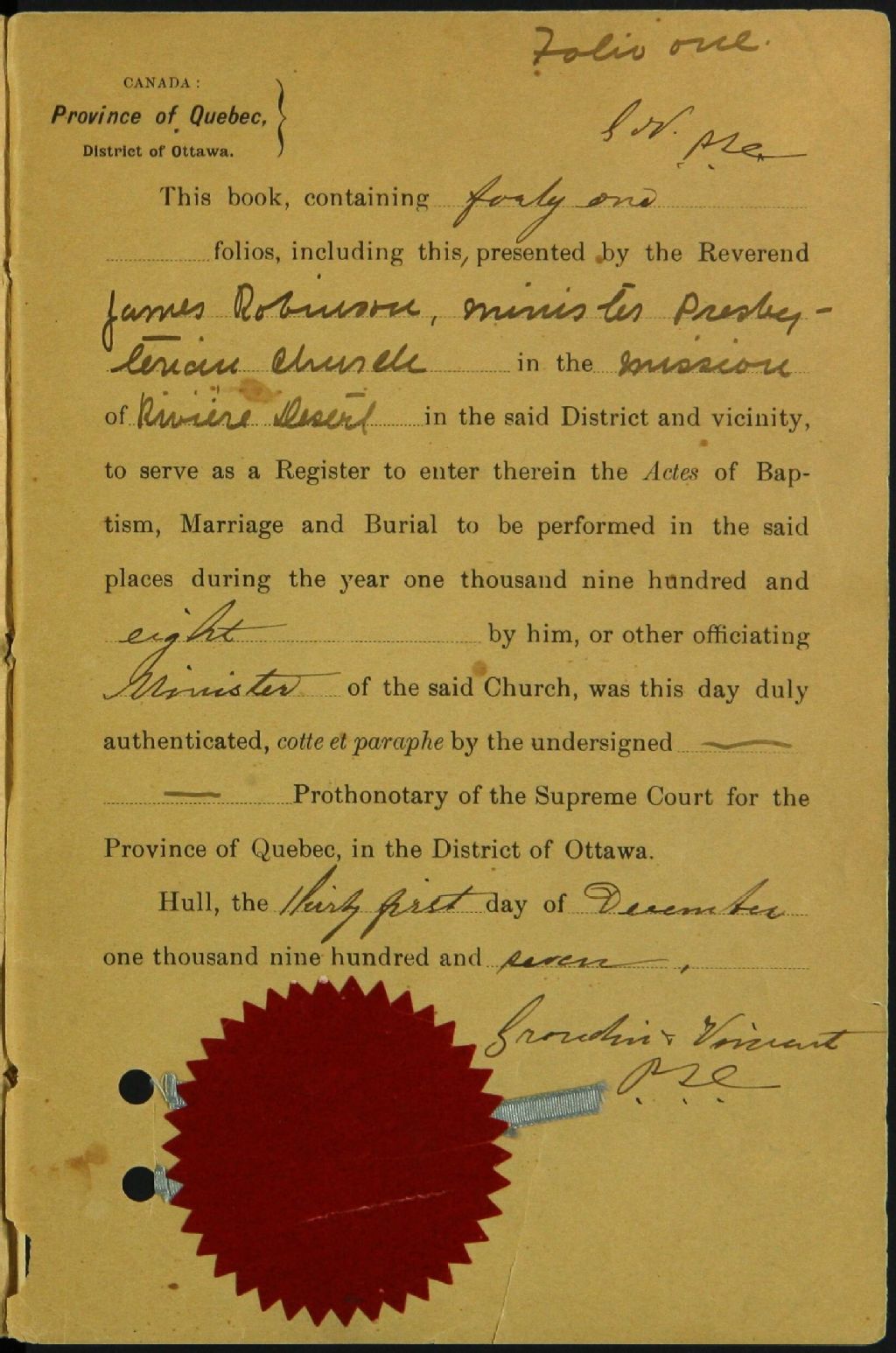 Maniwaki-Aylwin United Presbyterian Church, 1908-1921, Archives nationales à Montréal, Fonds Cour supérieure. District judiciaire de Labelle. État civil, (06M,CE610,S27).