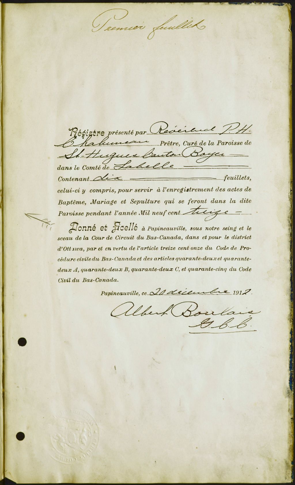 Saint-Hugues, 1915-1921, Archives nationales à Montréal, Fonds Cour supérieure. District judiciaire de Labelle. État civil, (06M,CE610,S32).