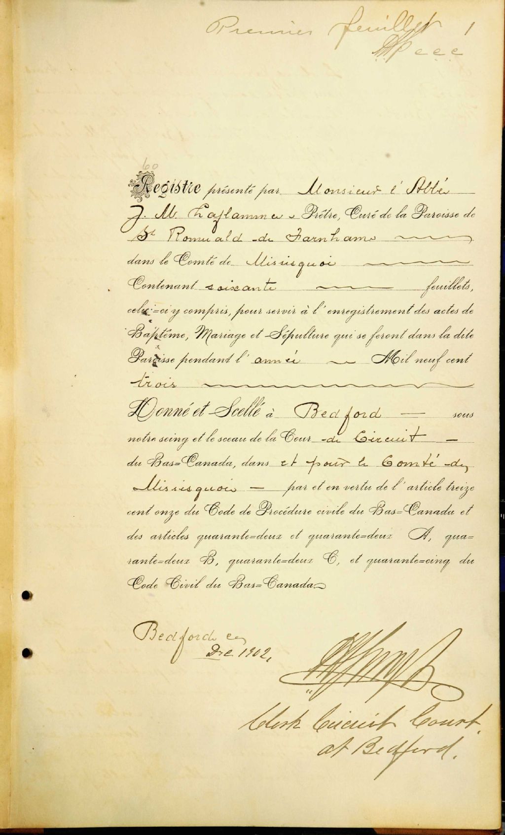 Saint-Romuald-de-Farnham, 1900-1921, Archives nationales à Montréal, Fonds Cour supérieure. District judiciaire de Bedford. État civil, (06M,CE611,S10).